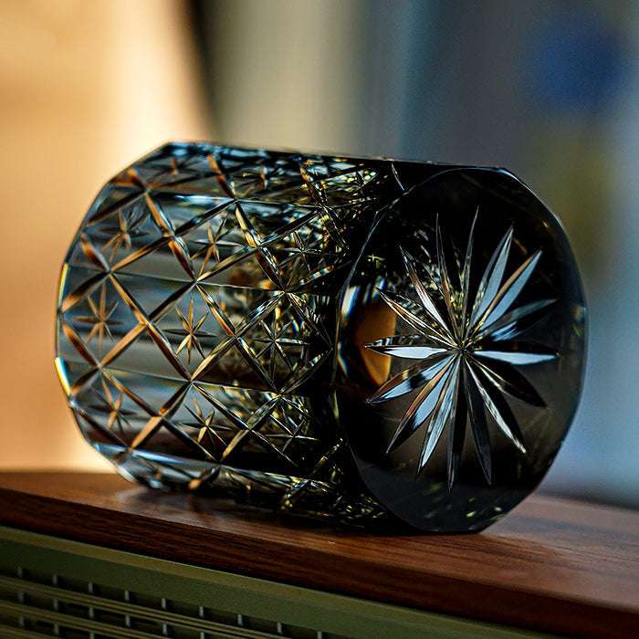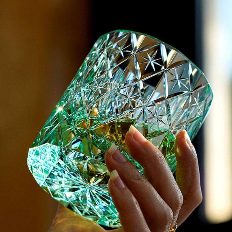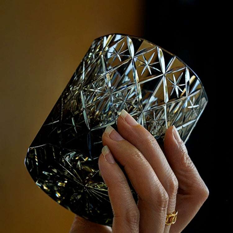The glass's design features a diagonal texture, adorned with twelve vertical facets and thirty-six stars, symbolizing the classic Shippo pattern. Each facet and star, meticulously crafted by skilled artisans, enhances its beauty and imbues the glass with soul. After over 1,500 polishing and finishing steps, the glass shimmers like the night sky, captivating even in low-light conditions.